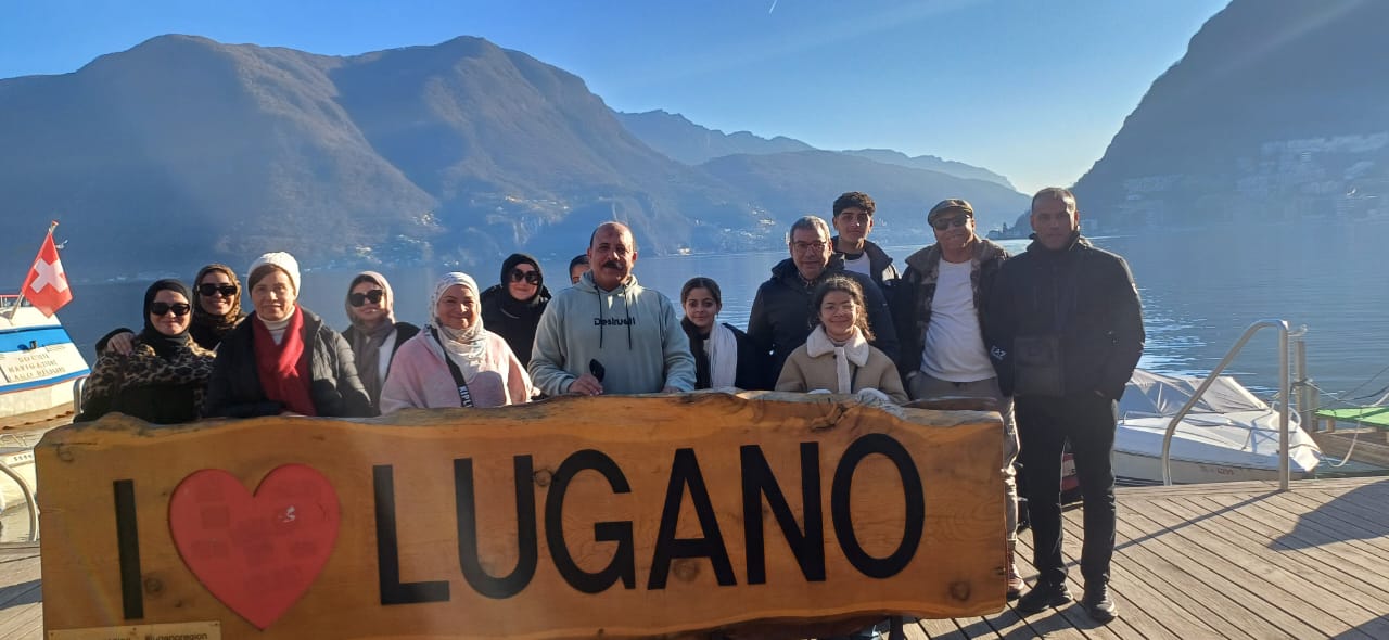 Here’s the English translation of the text from the image: Start your morning with breakfast at the hotel, then head to the Italian city of Como to enjoy the breathtaking view of Lake Como, surrounded by stunning mountains, offering a perfect chance to capture amazing photos. After that, we will head to the Swiss city of Lugano to enjoy the charming atmosphere of the city. A day filled with magical natural landscapes that will leave you with unforgettable memories!