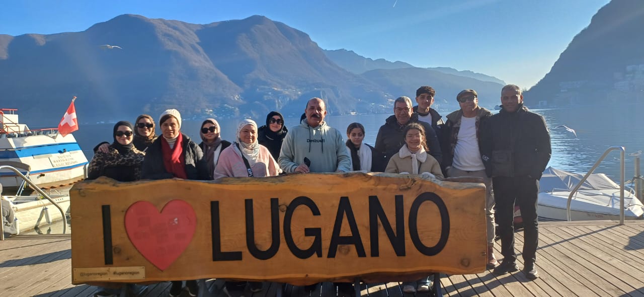 Here’s the English translation of the text from the image: Start your morning with breakfast at the hotel, then head to the Italian city of Como to enjoy the breathtaking view of Lake Como, surrounded by stunning mountains, offering a perfect chance to capture amazing photos. After that, we will head to the Swiss city of Lugano to enjoy the charming atmosphere of the city. A day filled with magical natural landscapes that will leave you with unforgettable memories!